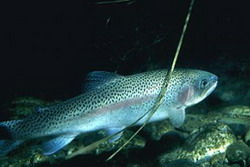 Kod nas to isto čini Kalifornijska pastrva (Salmo gairdneri) koja je dovedena još krajem 19. stoljeća da bi se ubrzo proširila morem u većinu naših rijeka. U nas je donešena iz San Francisca, gdje također nije domicilni stanovnik već je i tamo doputovala sa Kamčatke gdje je njena prava domovina. U rijeke se proširila iz ribogojilišta, jer se radi o vrsti koja se lako uzgaja. Lakše živi u vodama stajaćicama, no migrira u brzice čim uhvati priliku. Vrlo se lako prilagođava okolini, stoga su je gotovo sve zemlje uvezle radi proizvodnje a mnoge imaju problema zbog uništavanja autohtonih vrsta koje ne trpe njezino prisustvo. Karakteristična je po ljubičastoj pruzi uz bočnu crtu. Kao mlada ponekad ima puno više crnih pjega koje su često veće nego kod odraslih. Hrani se gotovo svime što pliva i kukcima koji dolaze nad površinu vode. Ova vrsta naraste preko 20 kg. Kod nas se uzgaja na mnogim mjestima, u potocima i u Jadranskom moru na nekoliko lokacija. Na Jadranu se može uloviti gotovo svugdje, a poznata su pojavljivanja ove vrste na najudaljenijim dalmatinskim otocima - miljama daleko od obale i ušća rijeka.